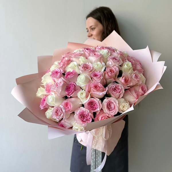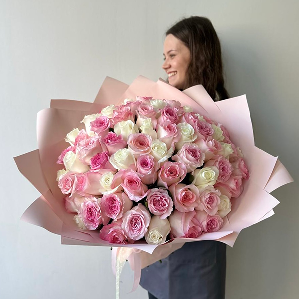 Большой букет из розовых и белых роз от 8300