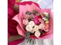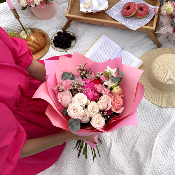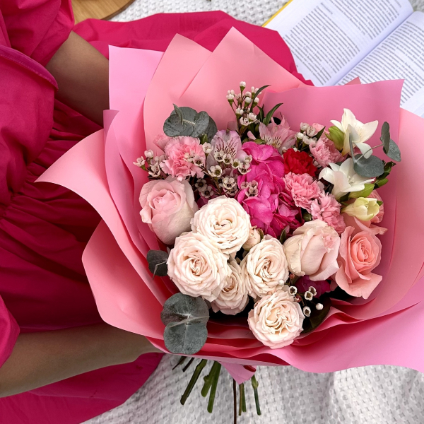 Роза, роза пионовиная кустовая, гортензия, фрезия, альстромерия, диантус, ваксфлауэр, эвкалипт, упаковка, лента атласная