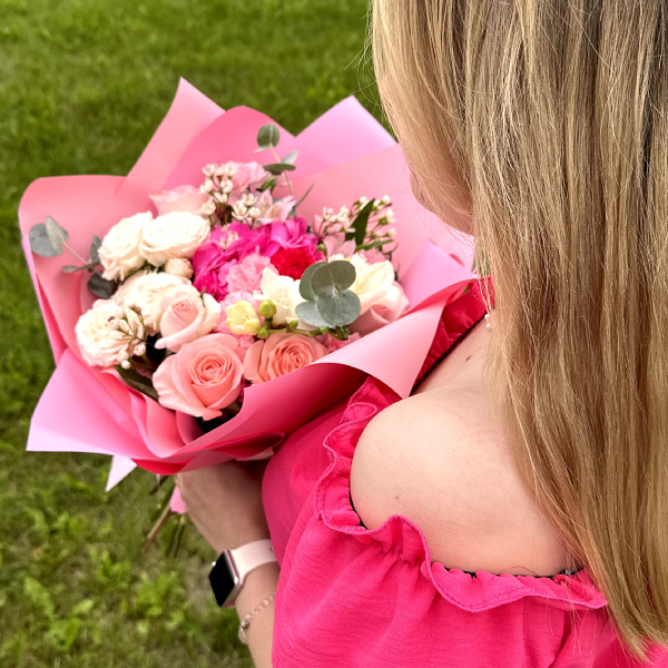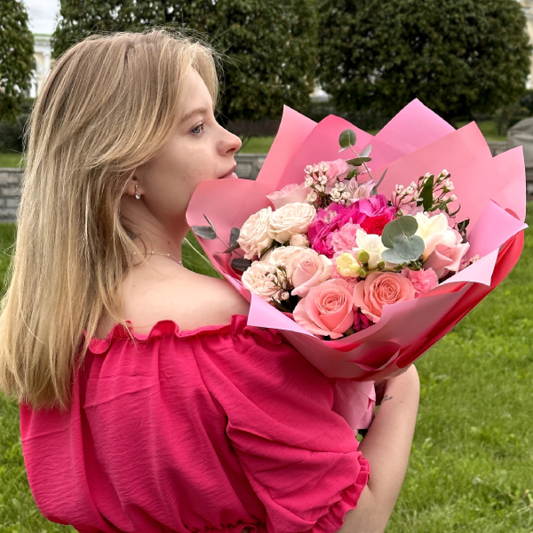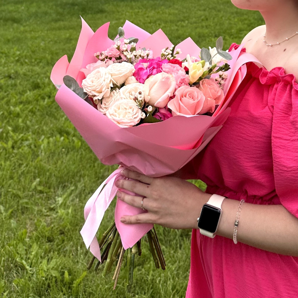 Роза, роза пионовиная кустовая, гортензия, фрезия, альстромерия, диантус, ваксфлауэр, эвкалипт, упаковка, лента атласная