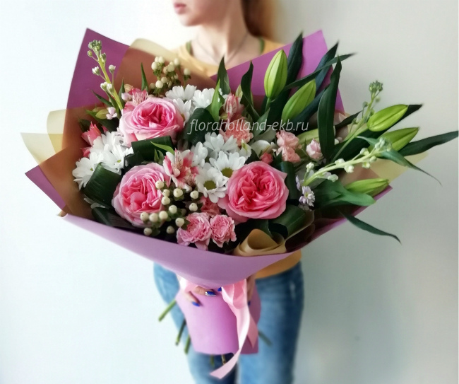 Роза пионовидная, роза кустовая, лилия, альстромерия, хризантема, гиперикум, маттиола, рускус, упаковка, лента атласная