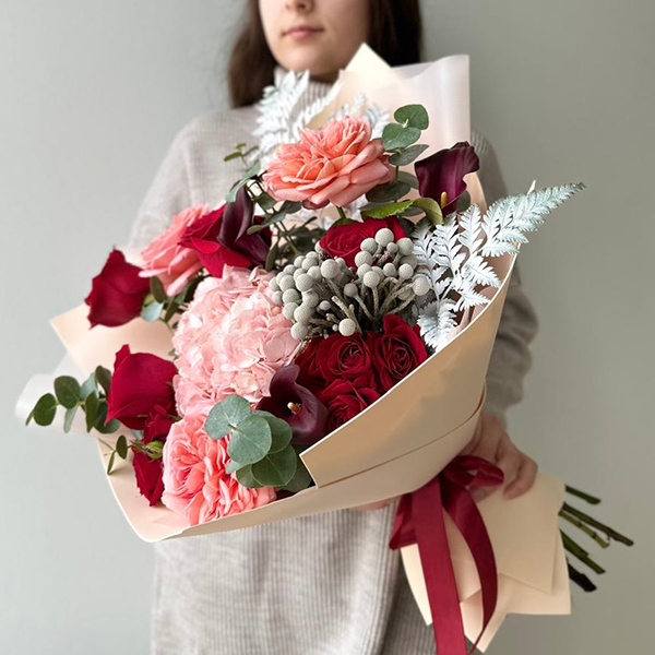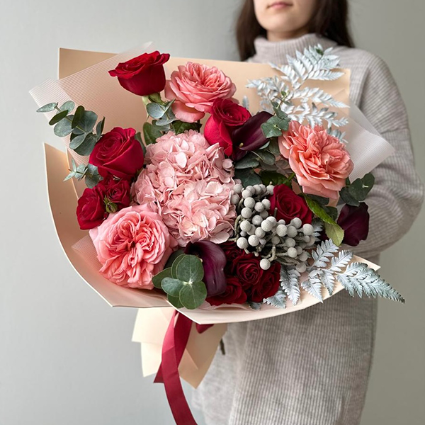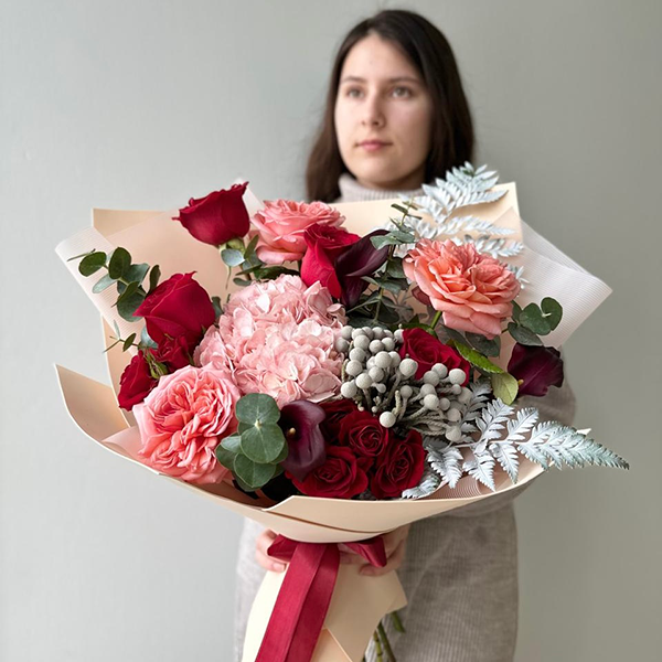 Розово-красный букет с гортензией, розой и брунией "Одри"