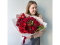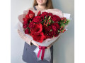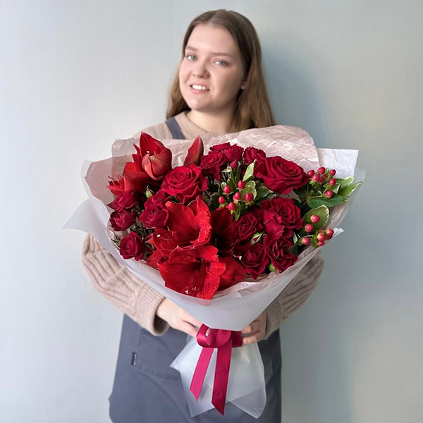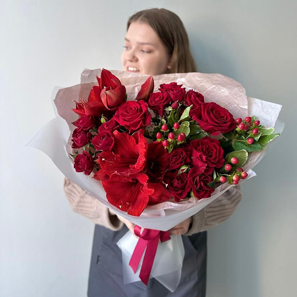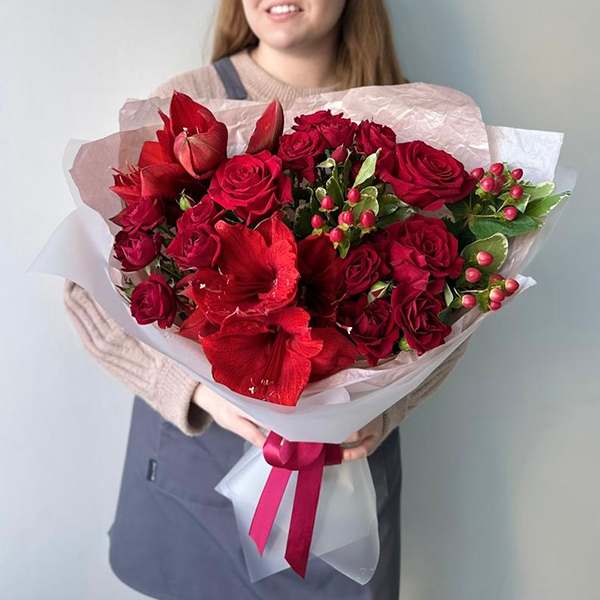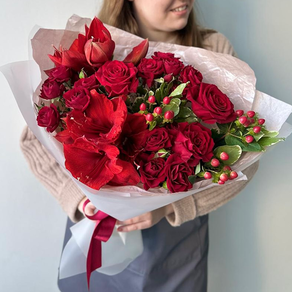 Амариллис, роза , роза кустовая, гиперикум, питтоспорум, упаковка, лента атласная