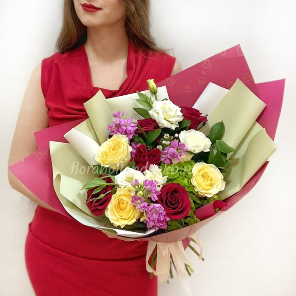 Роза, роза пионовидная, гортензия, маттиола, эустома, ваксфлауэр, рускус, упаковка, лента атласная