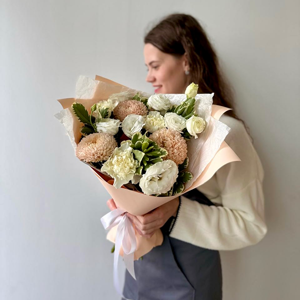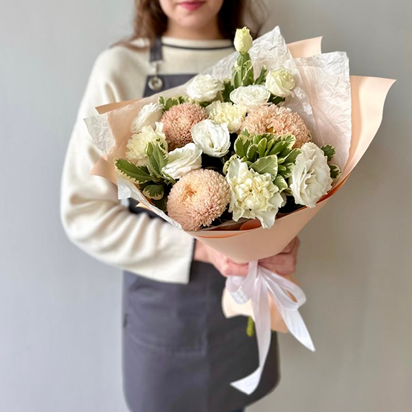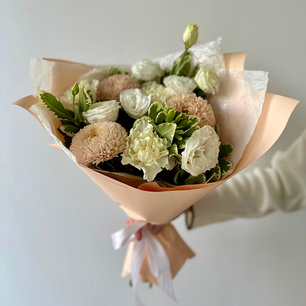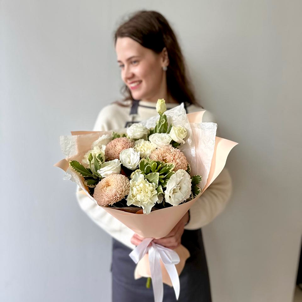 Нежный персиковый букет с воздушкой эустомой, сортовыми астрами и стойкими диантусам "Айви" от 2450
