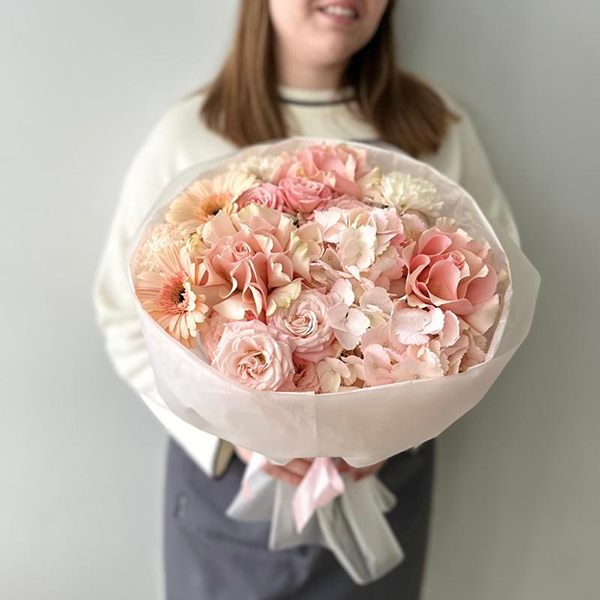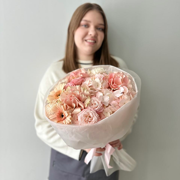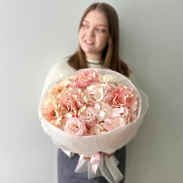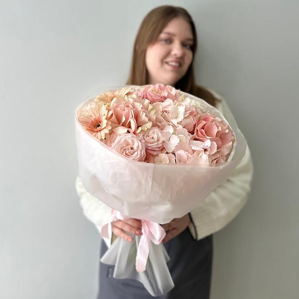Нежно-розовый букет с гортензией, герберами и французскими розами "Алиса"