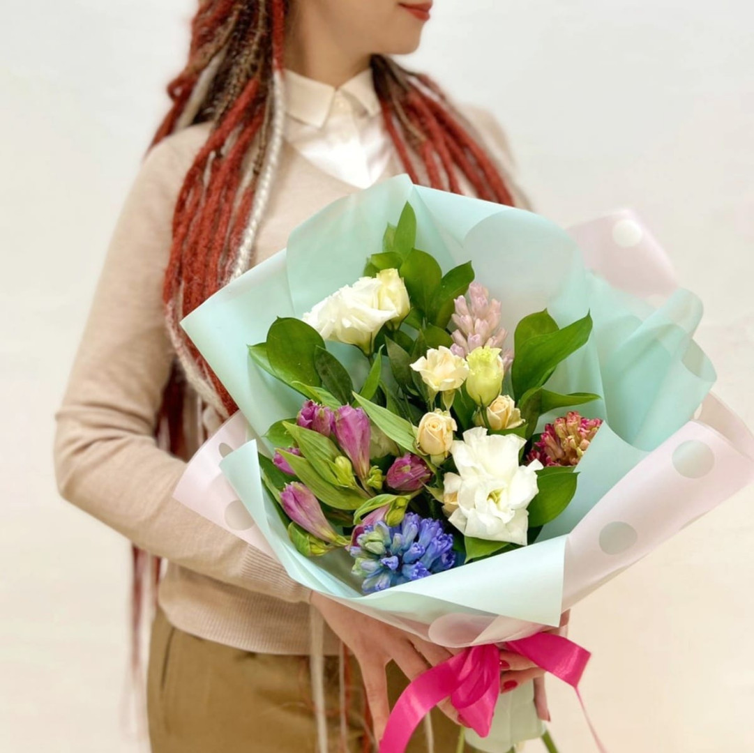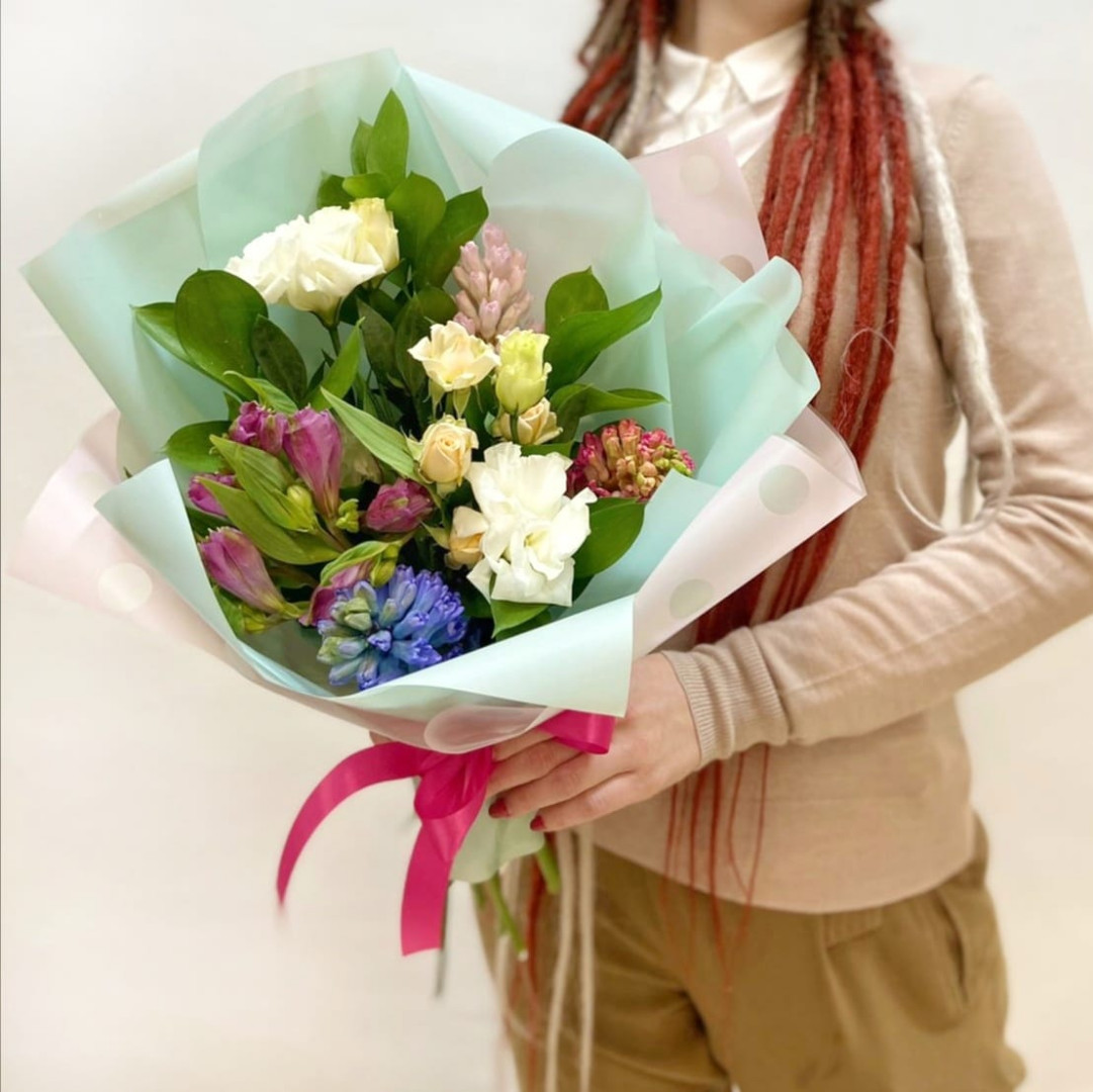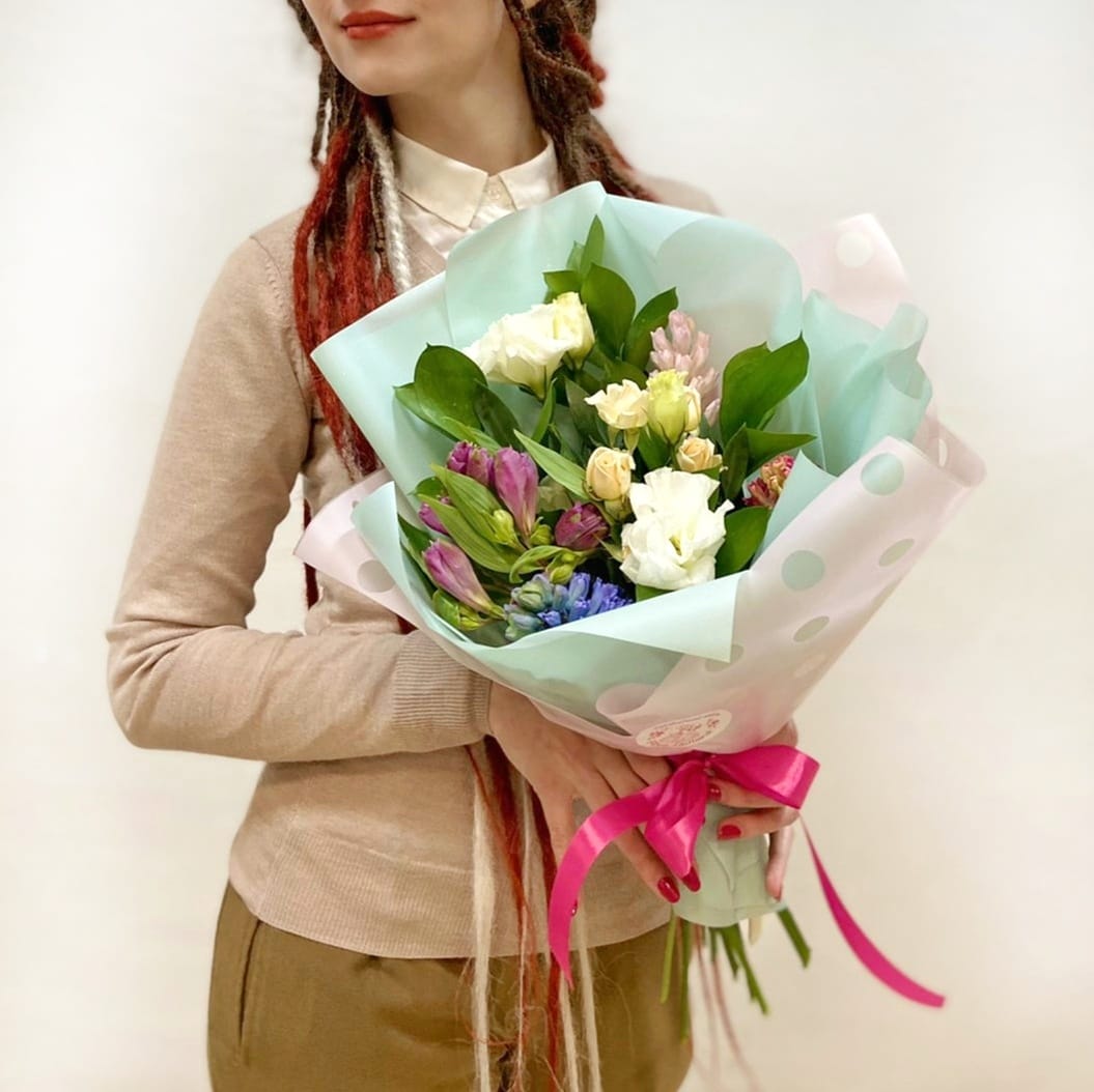 Гиацинт, роза кустовая, эустома, альстромерия, рускус, упаковка, лента атласная