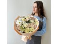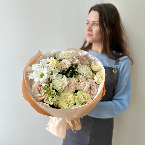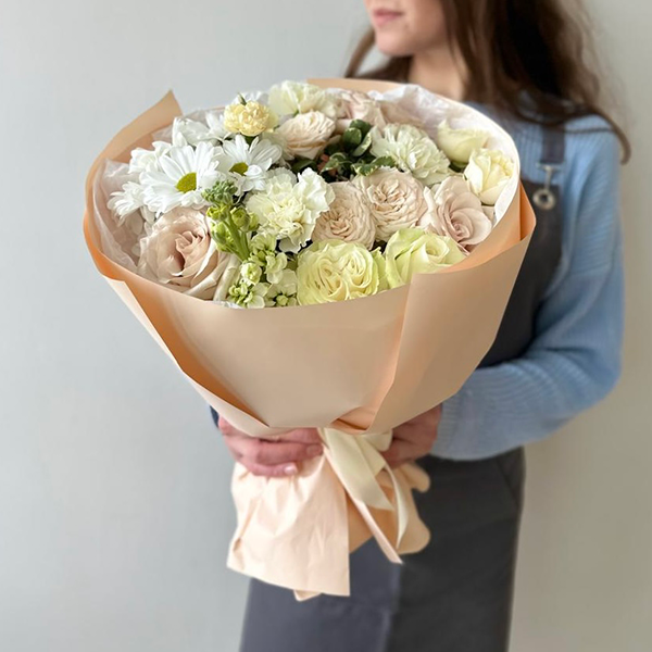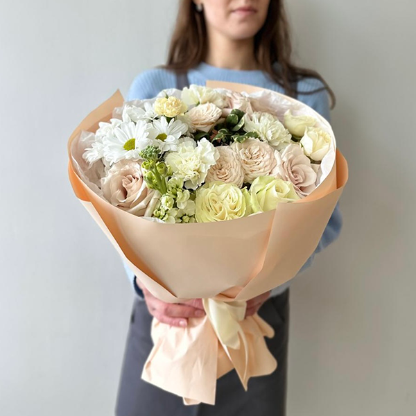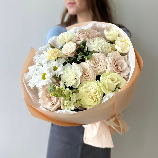 Роза, роза пионовиная кустовая, маттиола,хризантема, диантус, питтоспорум, упаковка, лента атласная