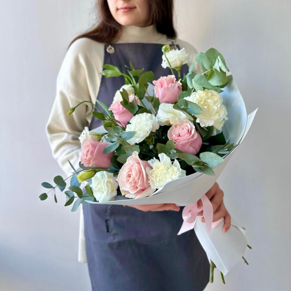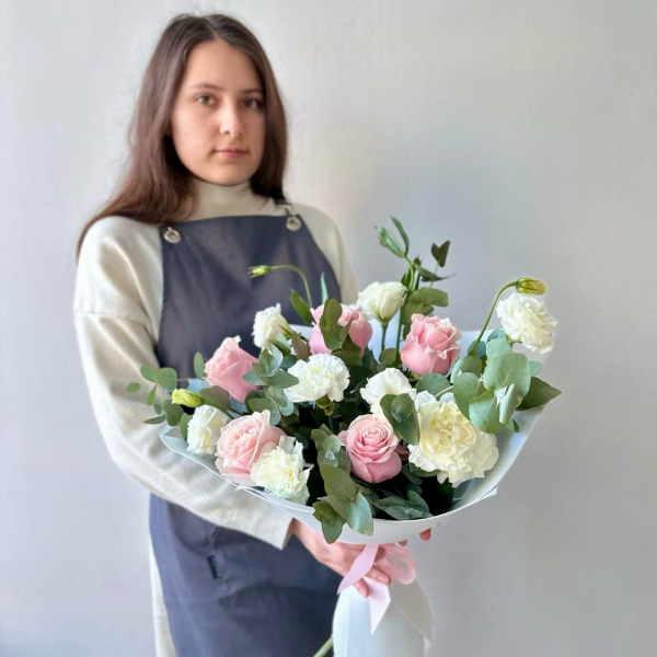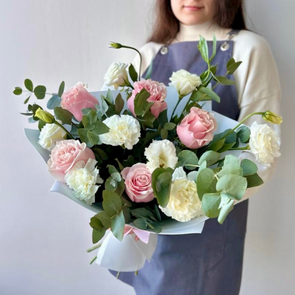 Роза, эустома, диантус, эвкалипт, упаковка, лента атласная