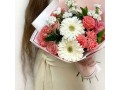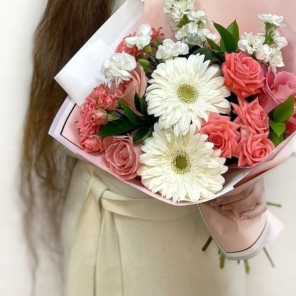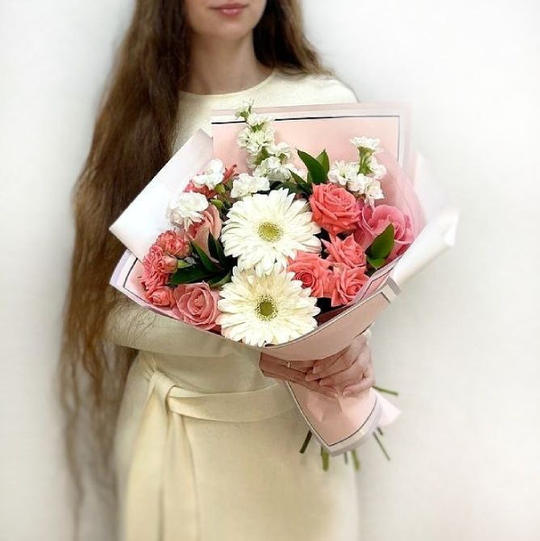 Гербера, роза, роза кустовая, маттиола, диантус, рускус, упаковка, лента атласная
