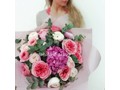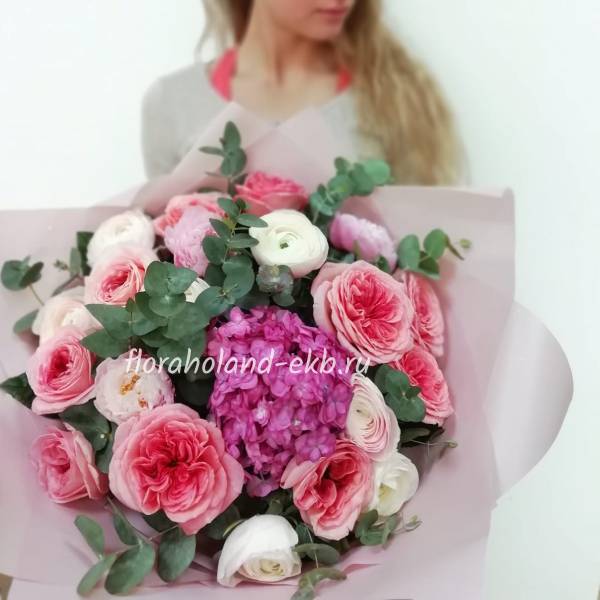 Роза, роза пионовидная, пион, гортензия, ранункулюс, эустома, упаковка, лента атласная