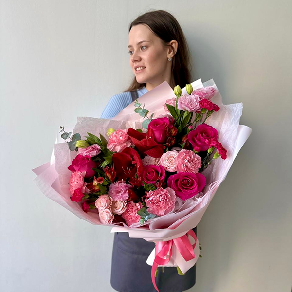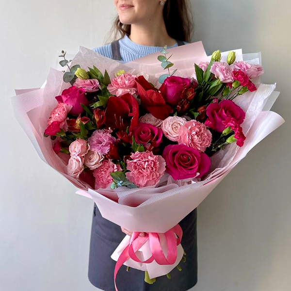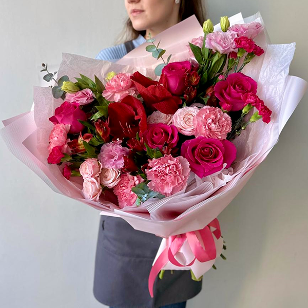 Амариллис, роза пионовиная, роза, диантус, эустома, альстромерия, эвкалипт, упаковка, лента атласная