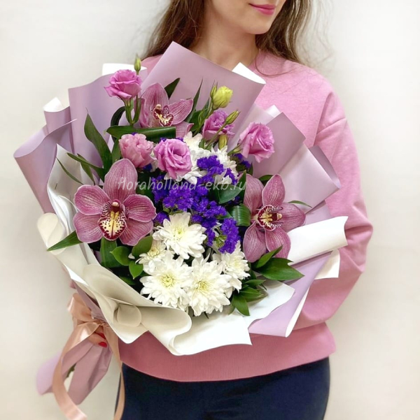 Орхидея, Эустома, хризантема, статица, аспидистра, рускус, упаковка, лента атласная