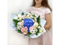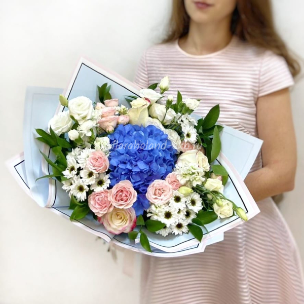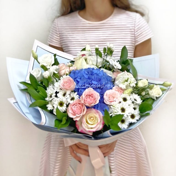 Гортензия, хризантема кустовая, роза, роза кустовая, эустома, рускус, упаковка, лента атласная