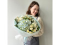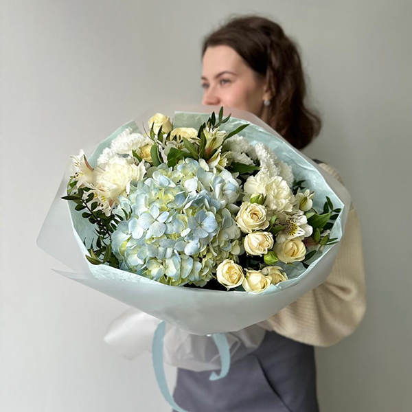 Воздушный голубой букет с гортензией и кустовыми розами "Глори"