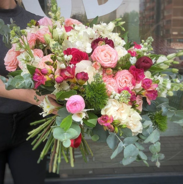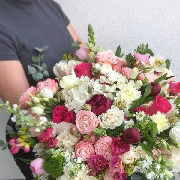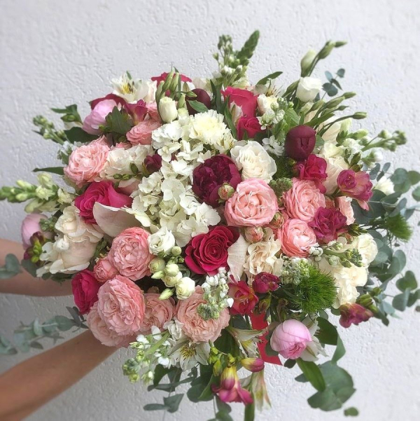 Гортензия, пион, роза, роза пионовидная кустовая, фрезия, альстромерия, эустома, маттиола, антирхинум, ранункулюс, эвкалипт, упаковка, лента атласная