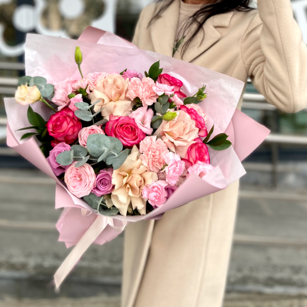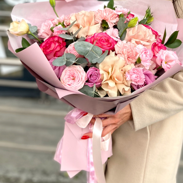 Роза, роза кустовая пионовидная, эустома, диантус, эвкалипт, упаковка, лента атласная