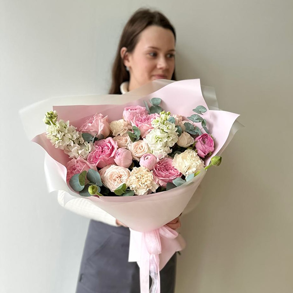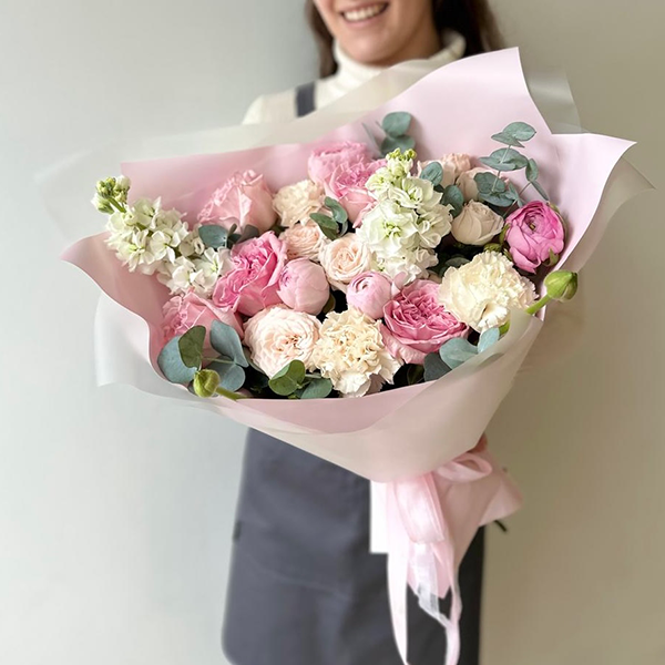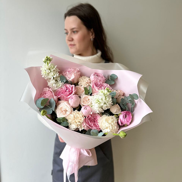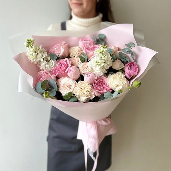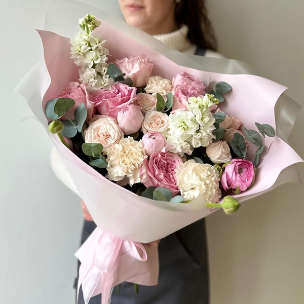 Роза пионовиная, роза пионовидная кустовая, ранункулюс, маттиола, диантус, эвкалипт, упаковка, лента атласная