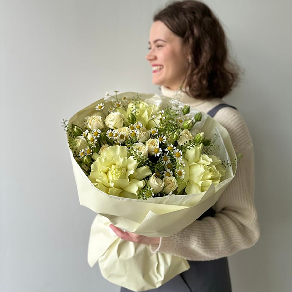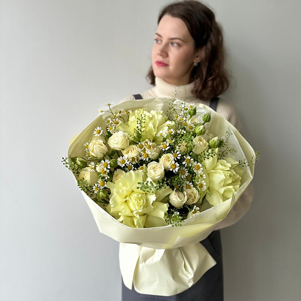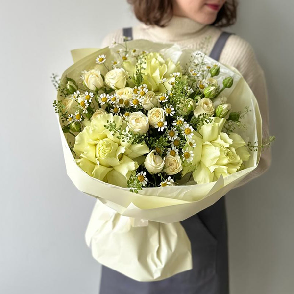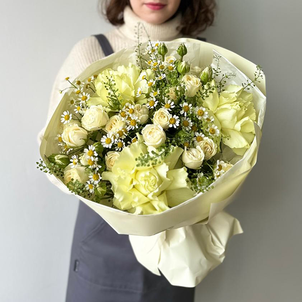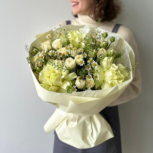 Букет с французскими розами и полевыми ромашками "Люси" от 2950