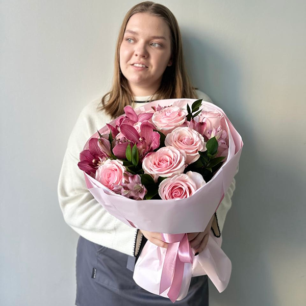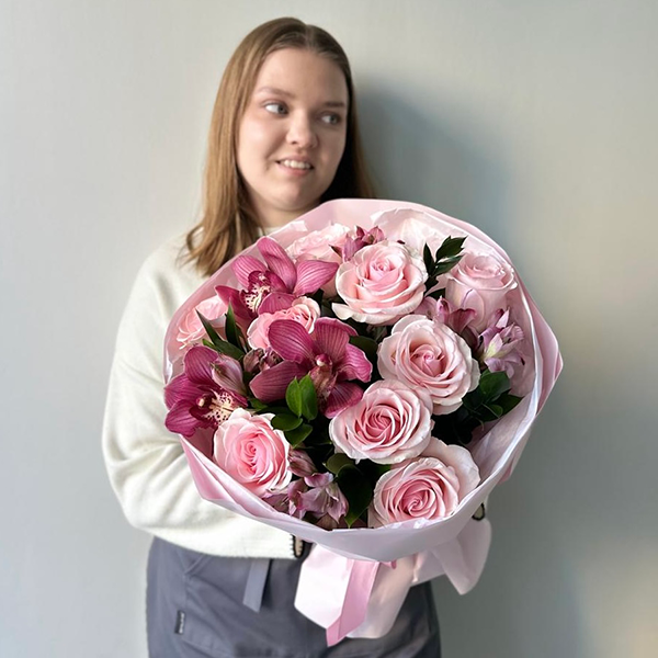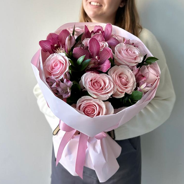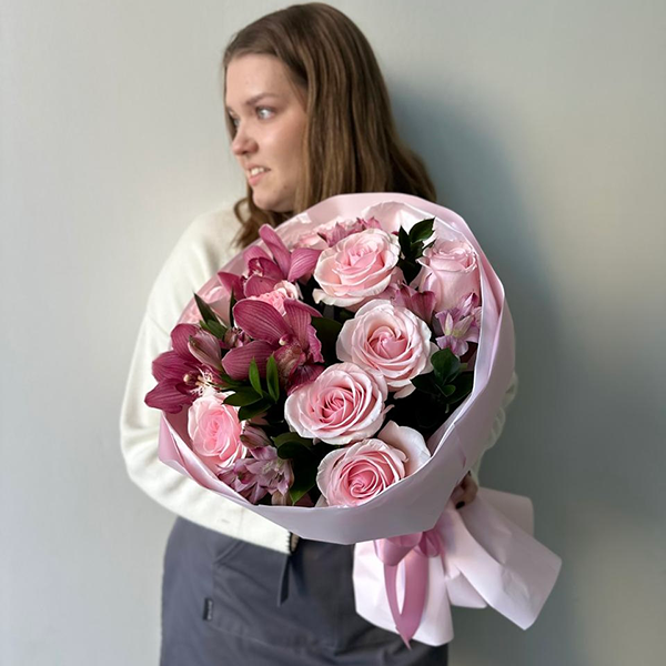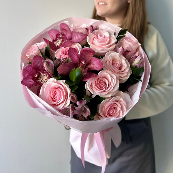Розовый букет с розами и орхидеями "Мари" от 4180