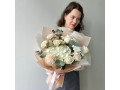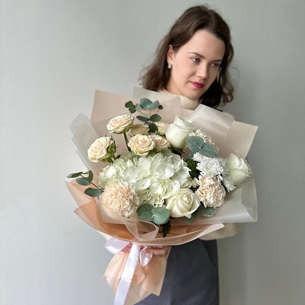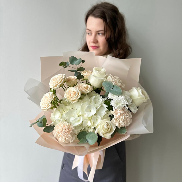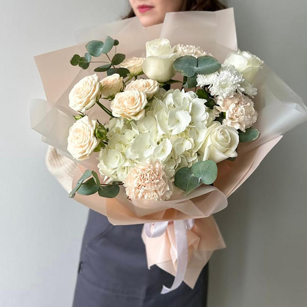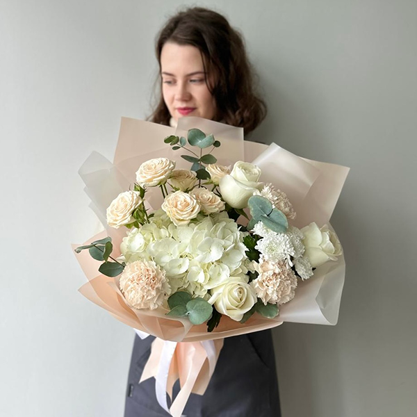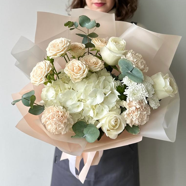 Гортензия, роза, роза кустовая пионовидная, хризантема, диантус, эвкалипт, упаковка, лента атласная