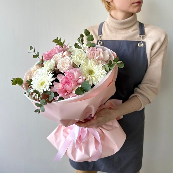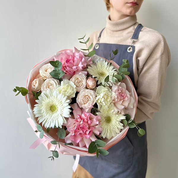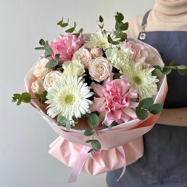 Роза французская, роза кустовая пионовидная, гербера, диантус, эвкалипт, упаковка, лента атласная