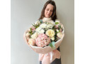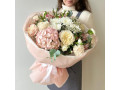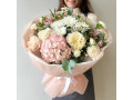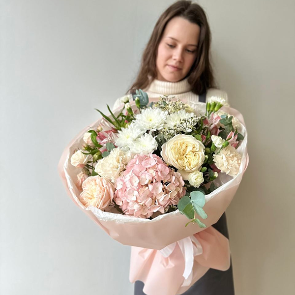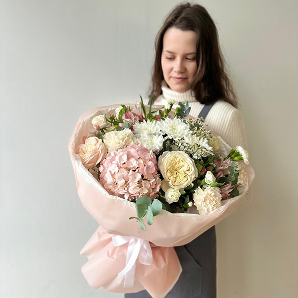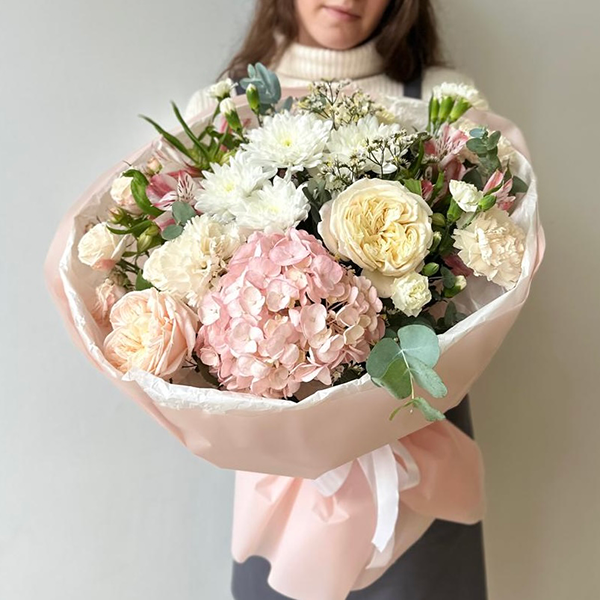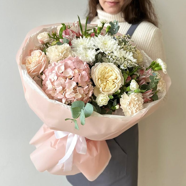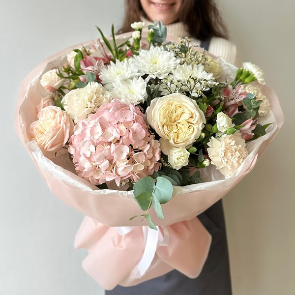 Гортензия, роза пионовидная, диантус, альстромерия, хризантема, лимониум, эвкалипт, упаковка, лента атласная