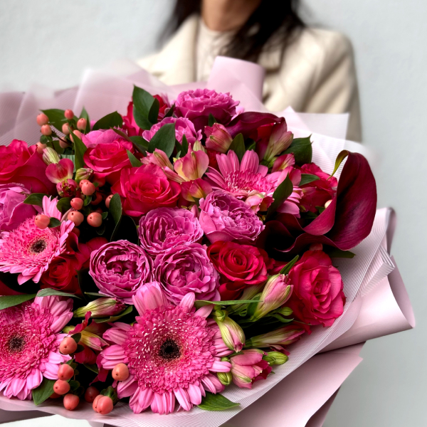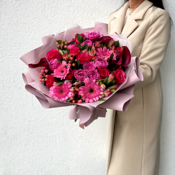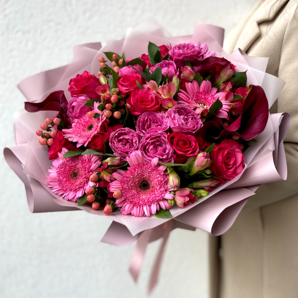 Гербера, роза, роза кустовая пионовидная, альстромерия, калла, гиперикум, рускус, упаковка, лента атласная