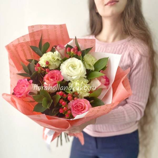 Роза, ранункулюс или пионовидная роза, диантус, гиперикум, рускус, упаковка, лента атласная