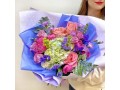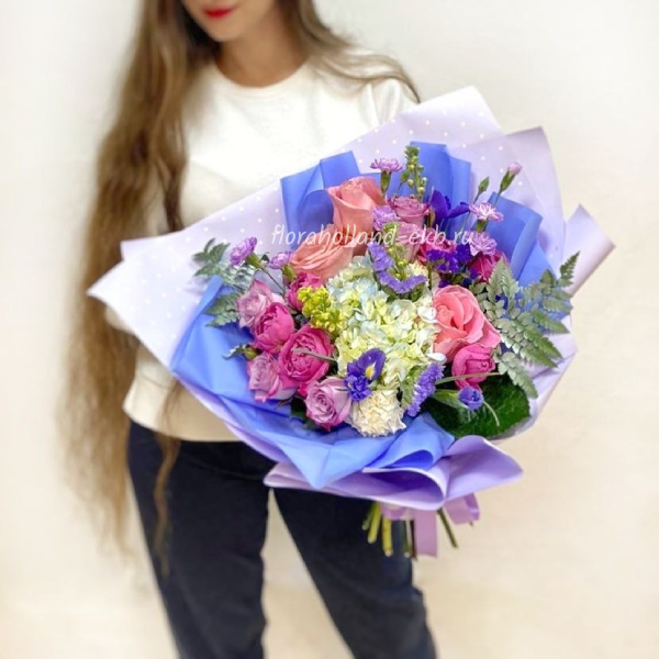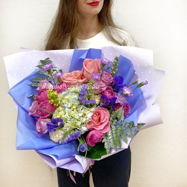 Гортензия, роза, роза пионовиная кустовая, диантус, эустома, маттиола, ирис, статица, зелень, упаковка, лента атласная