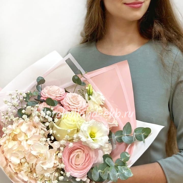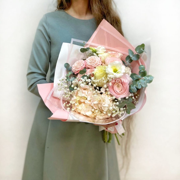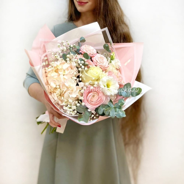 Гортензия, роза, роза пионовиная кустовая, ранункулюс или пионовидная роза, эустома, гипсофила, эвкалипт, упаковка, лента атласная