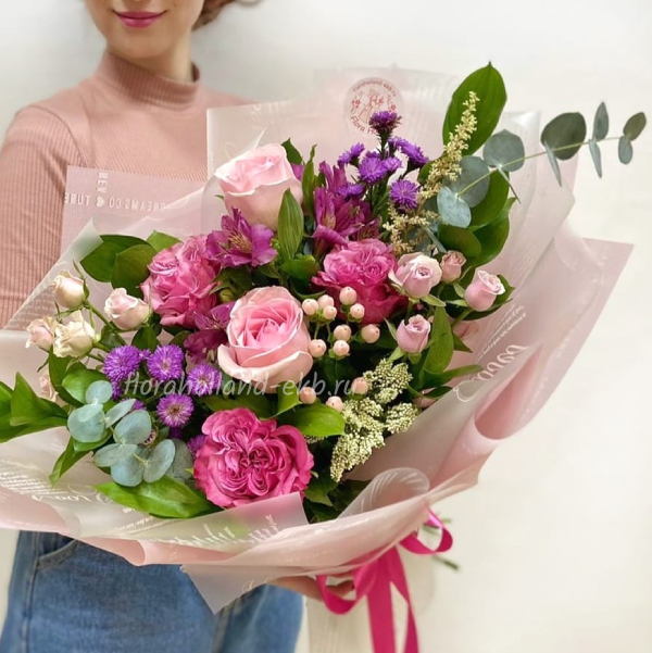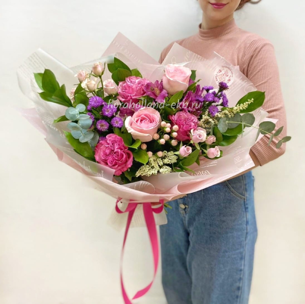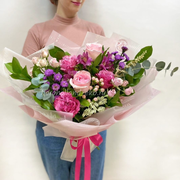 Роза, роза пионовидная, роза кустовая, альстромерия, вероника кустовая, астер, астильба, эвкалипт, рускус, упаковка, лента атласная