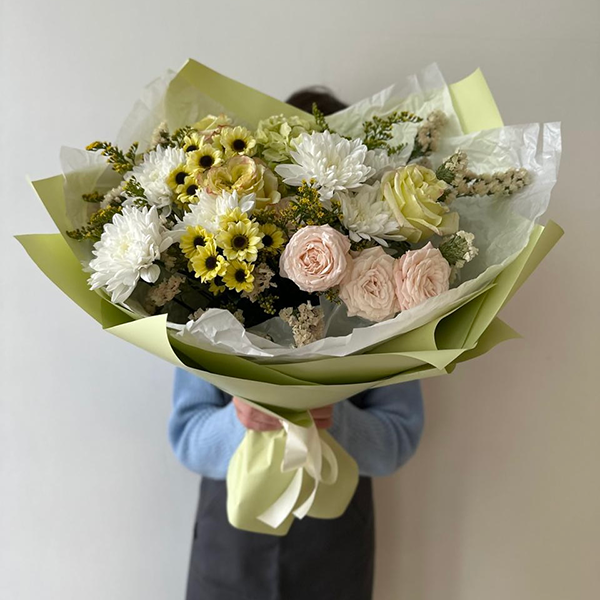 Воздушный букет из кустовых пионовидных роз и хризантем "Элли" от 3850