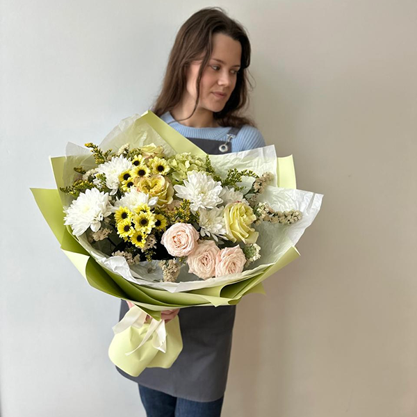 Воздушный букет из кустовых пионовидных роз и хризантем "Элли"
