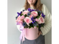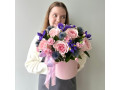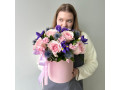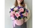 Композиция в шляпной коробке с розами, диантусами и ирисами № 110 от 4940