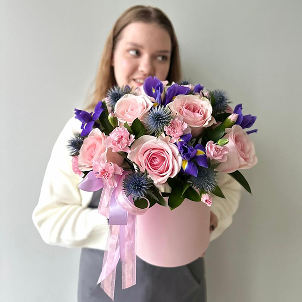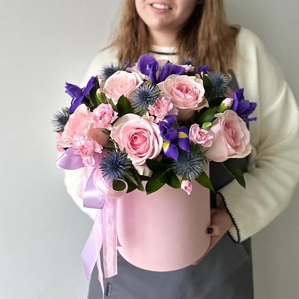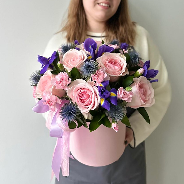 Композиция в шляпной коробке с розами, диантусами и ирисами № 110