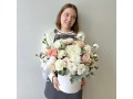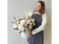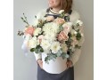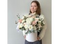 Воздушная белая композиция в шляпной коробке с хризантемами и розами № 133 от 4100