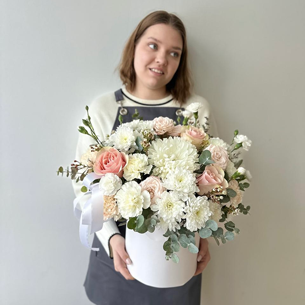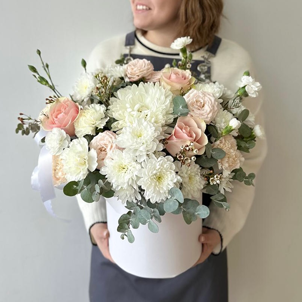 Воздушная белая композиция в шляпной коробке с хризантемами и розами № 133