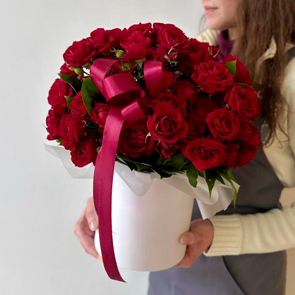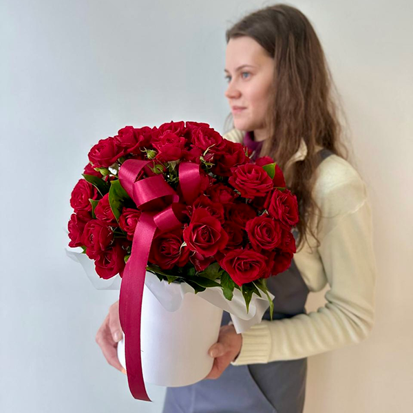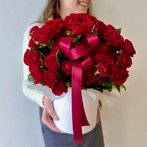 Композиция в шляпной коробке из красной кустовой розы № 69