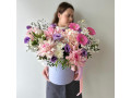 Композиция в шляпной коробке с французскими розами в розово-сиреневой гамме № 80