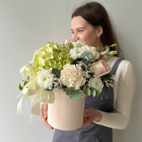 Нежная композиция в шляпной коробке с зеленой гортензией № 125 от 3500