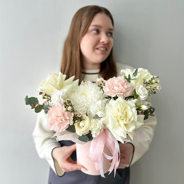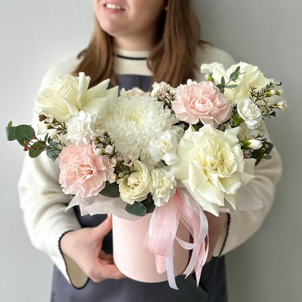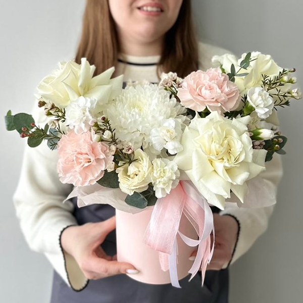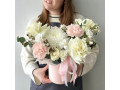 Нежно-розовая композиция в шляпной коробке с французскими розами и хризантемой № 127