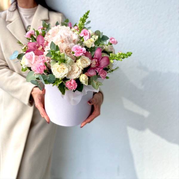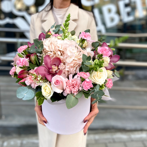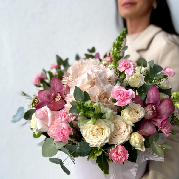 Гортензия, роза, роза кустовая пионовидная, орхидея, диантус, антирхинум, ваксфлауэрс, эвкалипт