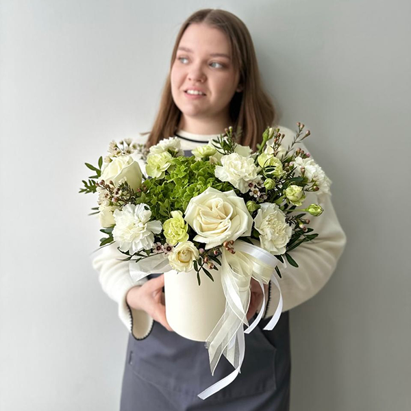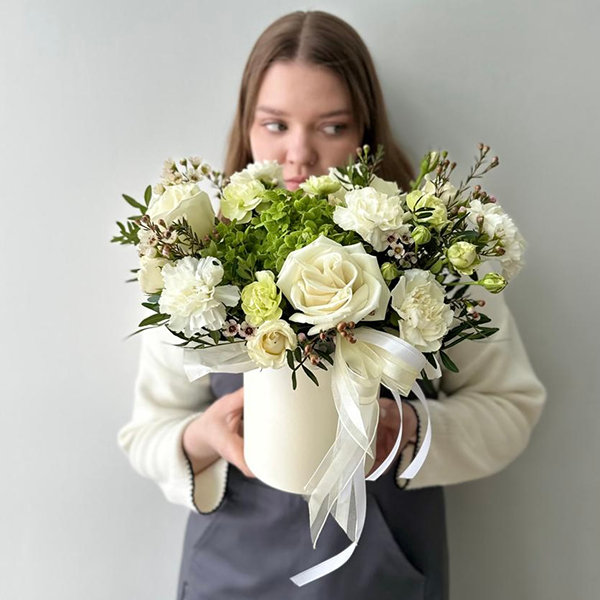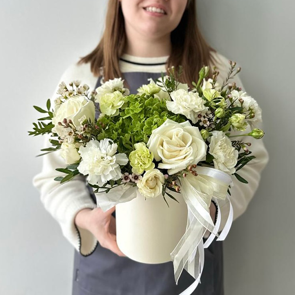 Композиция в шляпной коробке с белыми розами и зеленой гортензией № 10 от 3400