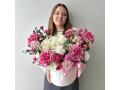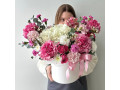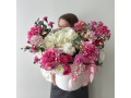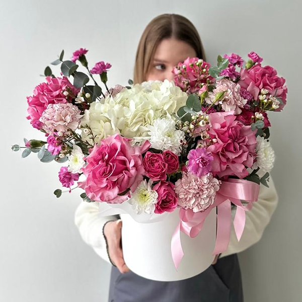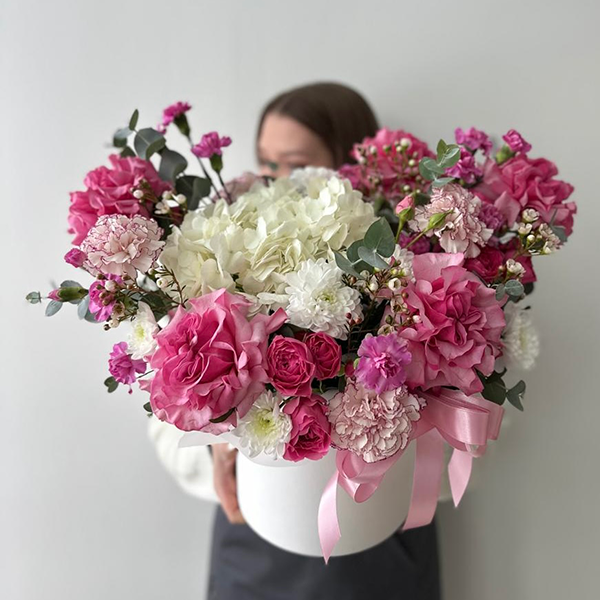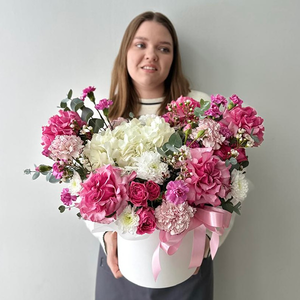 Композиция в шляпной коробке с французскими розами, гортензией и ваксфлауэрсом № 12