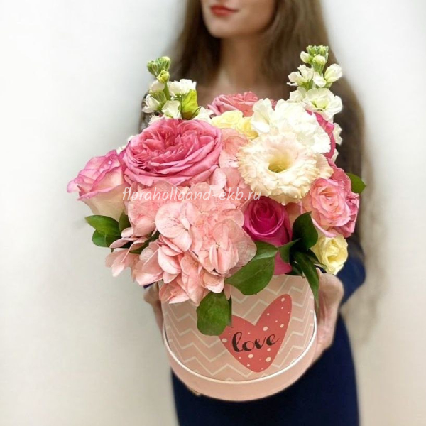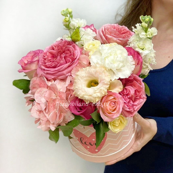 Гортензия, роза, роза кустовая, роза пионовидная, маттиола или антирхинум, диантус, эустома, рускус