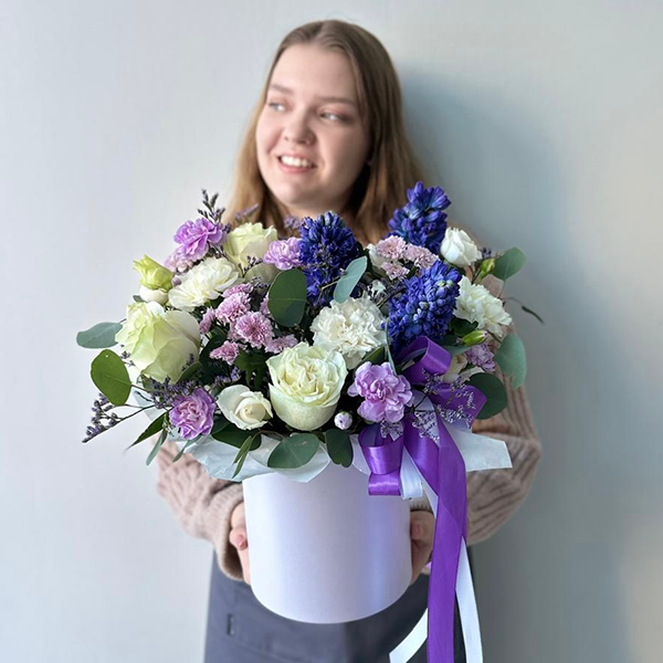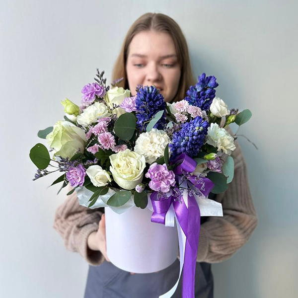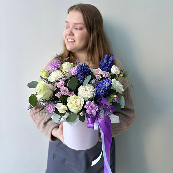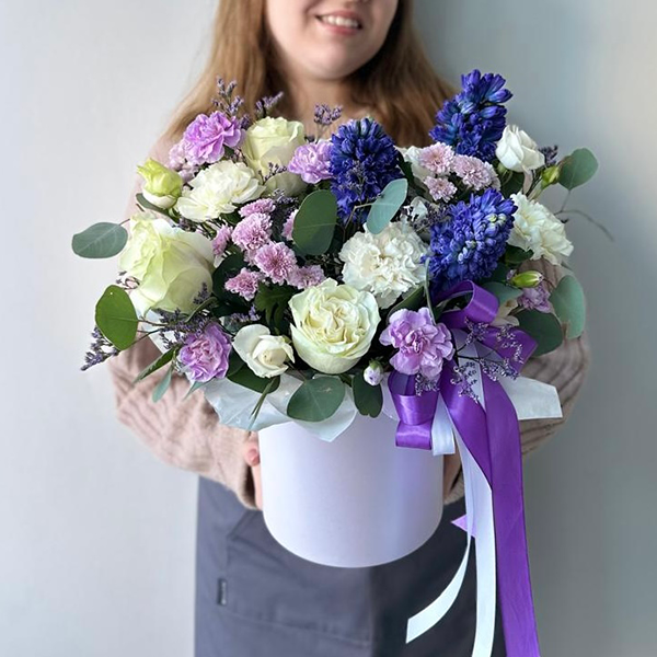 Композиция в шляпной коробке с ароматными гиацинтами и розами № 37 от 3990