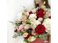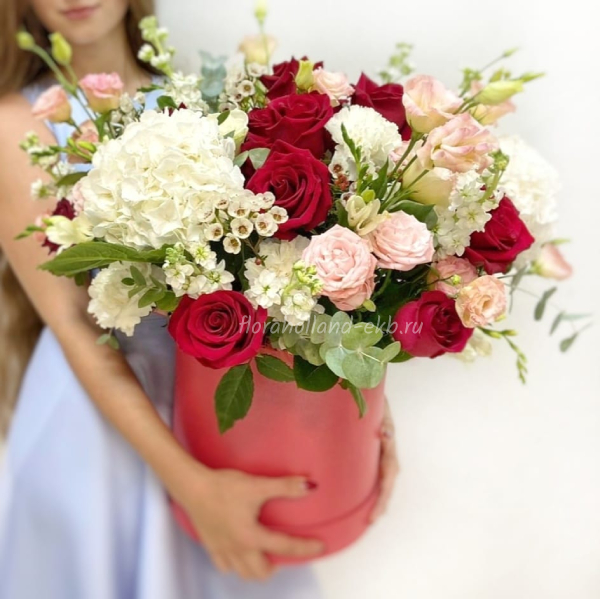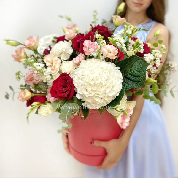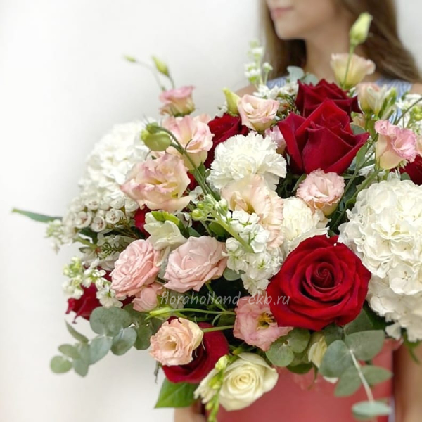 Гортензия, роза, роза кустовая, диантус, эустома, маттиола, фрезия, ваксфлауэр, эвкалипт, фисташка