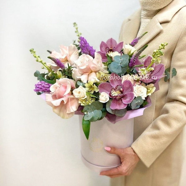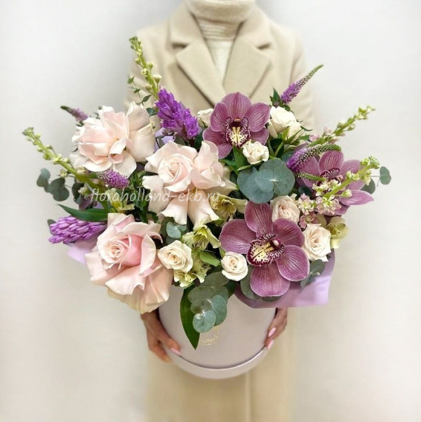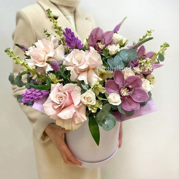 Роза, роза кустовая, орхидея, гиацинт, вероника, маттиола, альстромерия, эвкалипт, рускус