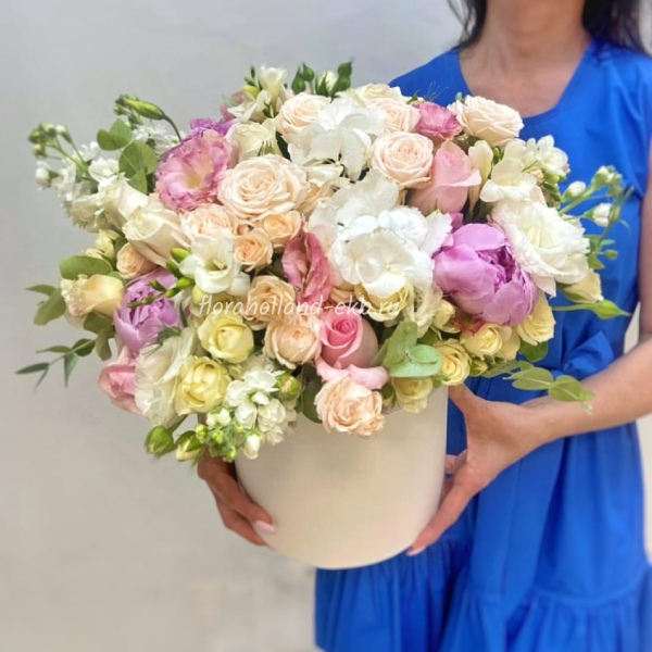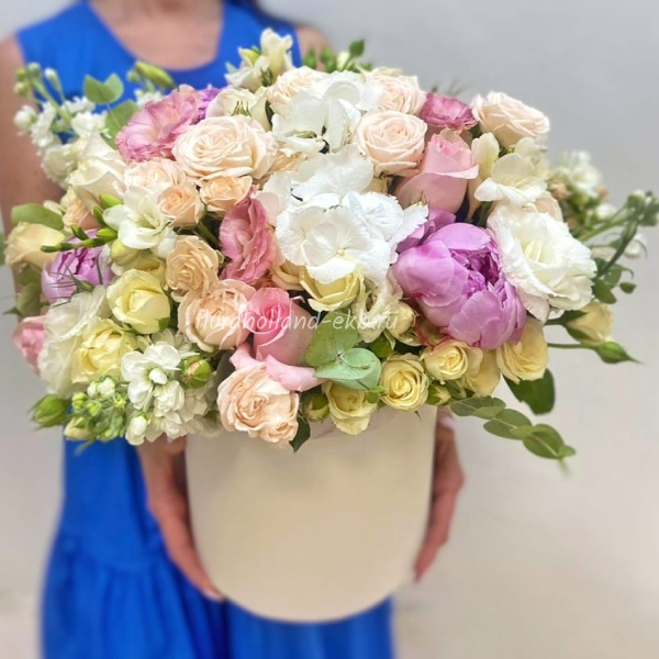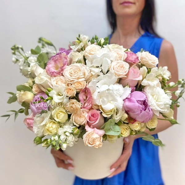 Гортензия, роза, роза кустовая, роза кустовая пионовидная, пион или пионовидная роза, эустома, маттиола,эвкалипт, фисташка