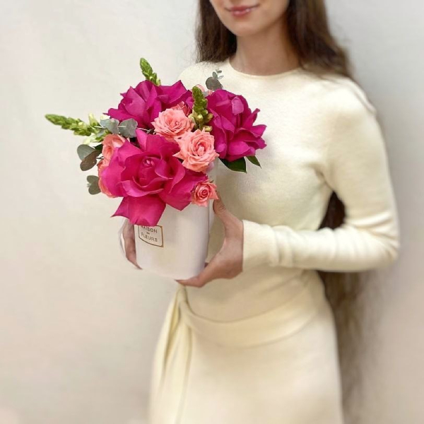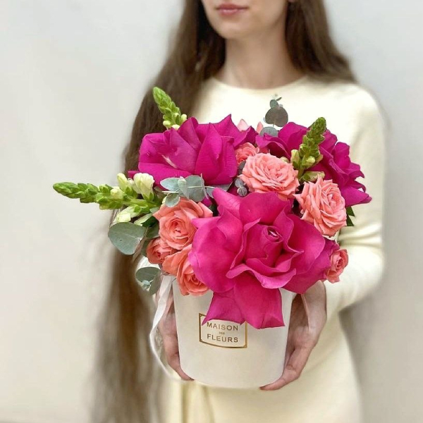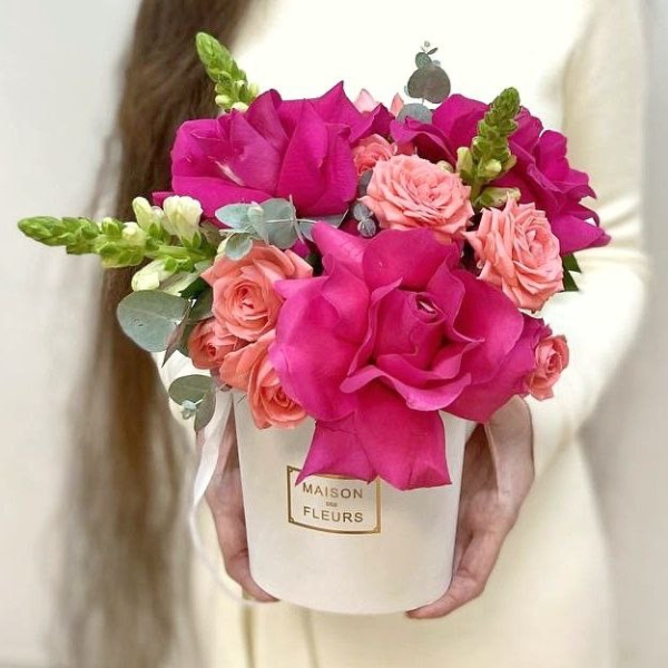 Роза, кустовая роза, антирхинум или маттиола, эвкалипт